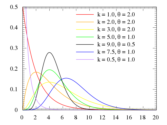 \[p(x\mid\alpha,\beta) =\frac{\beta^{\alpha}}{\Gamma(\alpha)}x^{\alpha-1}\exp{-\beta x}\] -