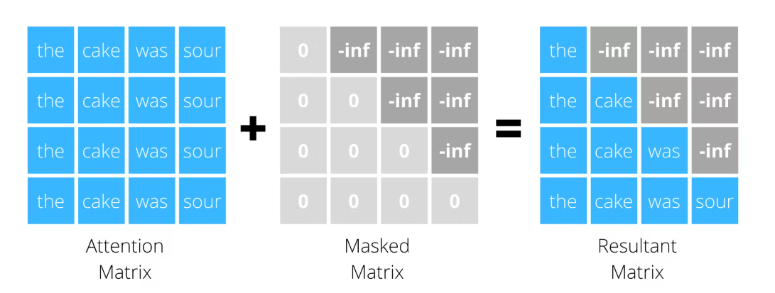 \[\begin{aligned} f\left(\mathcal{Q}_{M \times D}, \mathcal{K}_{N \times D}\right) + \mathbf{M}_{M \times N} \end{aligned}\]- 셀프 어텐션은 입력 데이터의 모든 위치가 서로 영향을 주고받는 구조이나, 시퀀스 생성 모형은 현재 순번 데이터로만 다음 순번을 예측해야 하므로, 미래 위치에 대한 주의 점수를 $-\infty$ 로 처리하여 모형이 해당 정보를 참조하지 못하도록 강제함