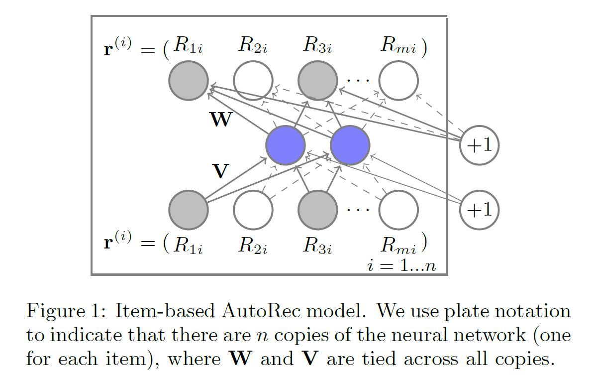 AutoRec: 오토인코더 기반 협업필터링 모형으로서, 연속적 출력값을 결정론적 함수로 도출하는 단일 신경망 구조를 통해 선행 협업필터링 모형에 비해 계산 효율성과 구조적 간결성을 도모함- Sedhain, S., Menon, A. K., Sanner, S., & Xie, L.