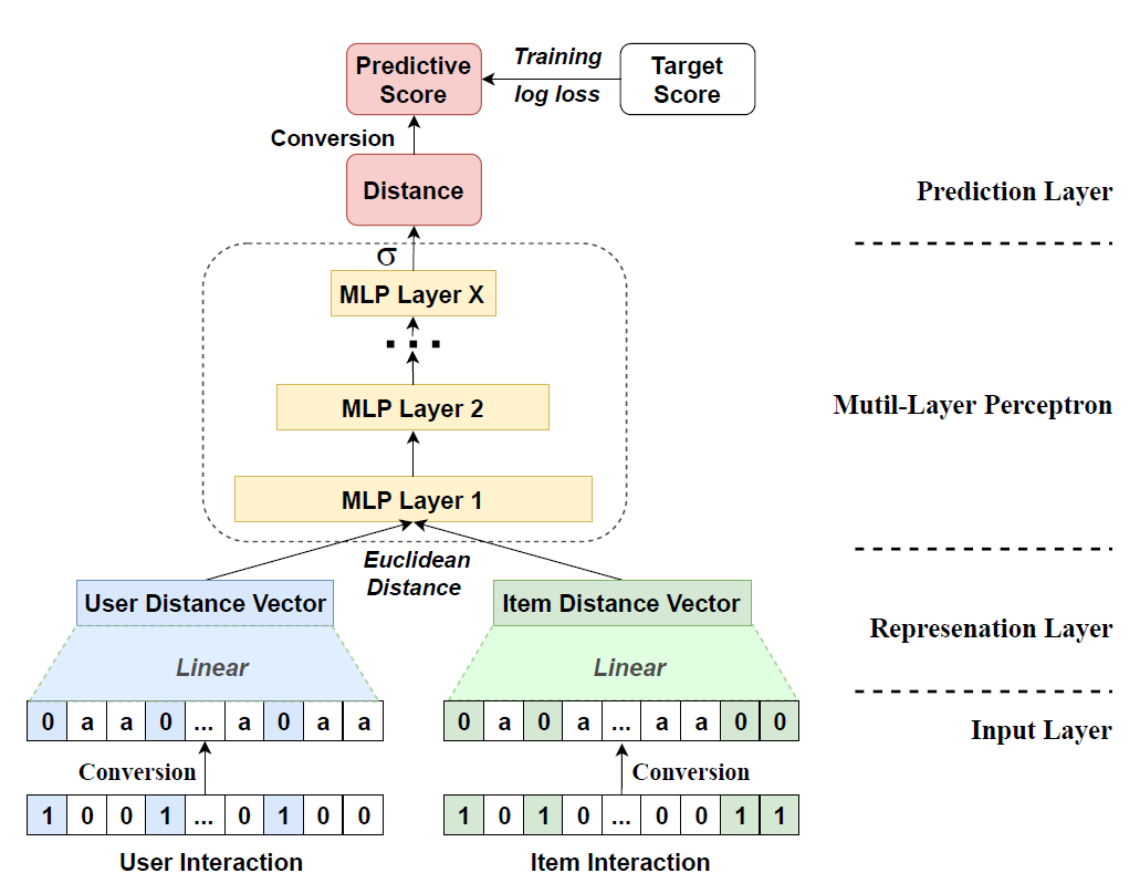 \[\begin{aligned} \overrightarrow{\mathbf{z}}_{u,i} &= \text{MLP}_{\text{ReLU}}(\text{dist}[\overrightarrow{\mathbf{p}}_{u}, \overrightarrow{\mathbf{q}}_{i}]) \end{aligned}\] -