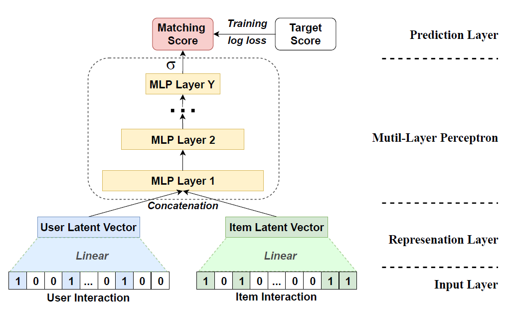 \[\begin{aligned} \overrightarrow{\mathbf{z}}_{u,i} &= \text{MLP}_{\text{ReLU}}(\overrightarrow{\mathbf{u}}_{u} \oplus \overrightarrow{\mathbf{v}}_{i}) \end{aligned}\] -