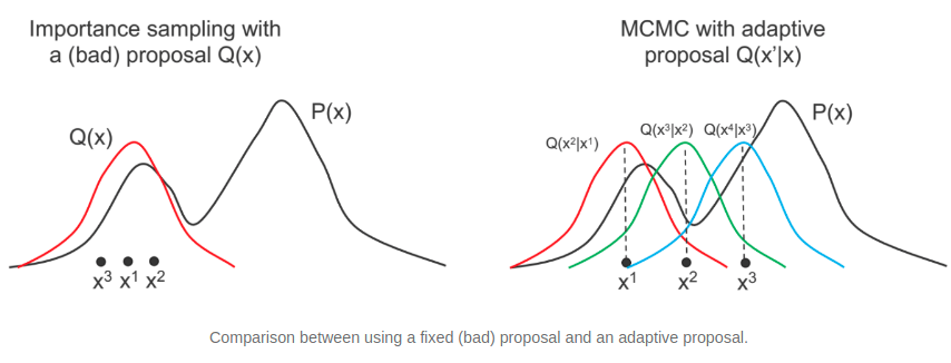 제안 분포(Proposal Dist.) : 시점 $t$ 에서 수락된 파라미터 샘플 $\theta^{(t)}$ 에 기반하여 다음 시점 $t+1$ 에서 샘플링 위치 $\psi$ 를 제안하는 분포