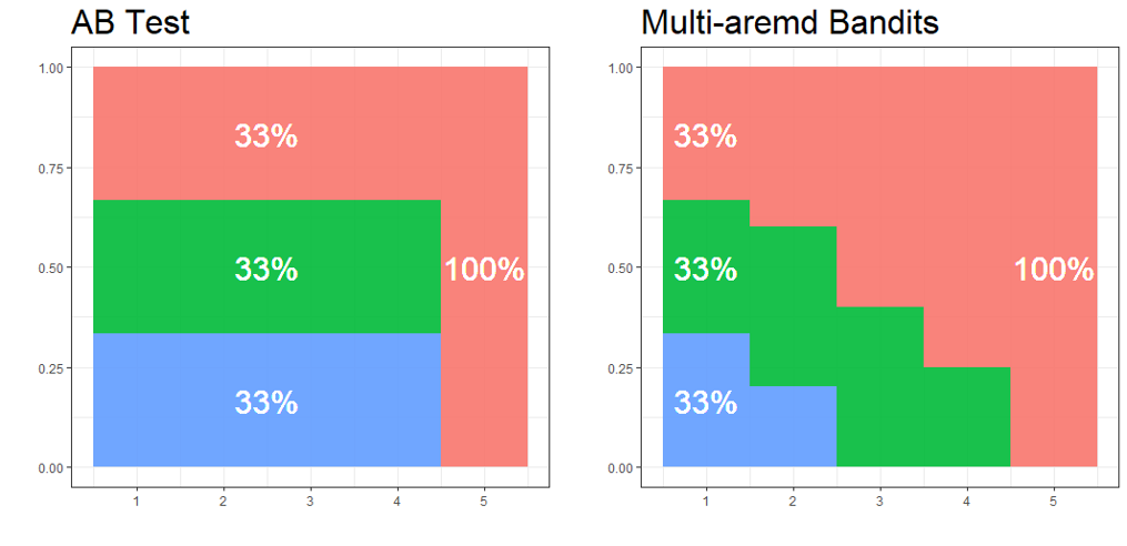 고객의 피드백을 실시간으로 반영하며 각 선택지의 보상 확률을 갱신함으로써 열등한 선택지는 비교적 적게 노출하고 우월한 선택지는 비교적 많이 노출함