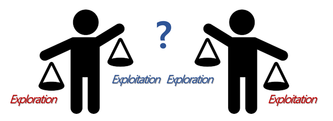만약 적당히 좋은 결과를 돌려주는 슬롯 머신을 찾아냈다면, 그 결과를 유지하기 위해 그 슬롯 머신을 활용할 것인가(Exploitation) 아니면 더 좋은 결과를 얻을 수 있다는 희망으로 다른 슬롯 머신을 탐색할 것인가(Exploration)?