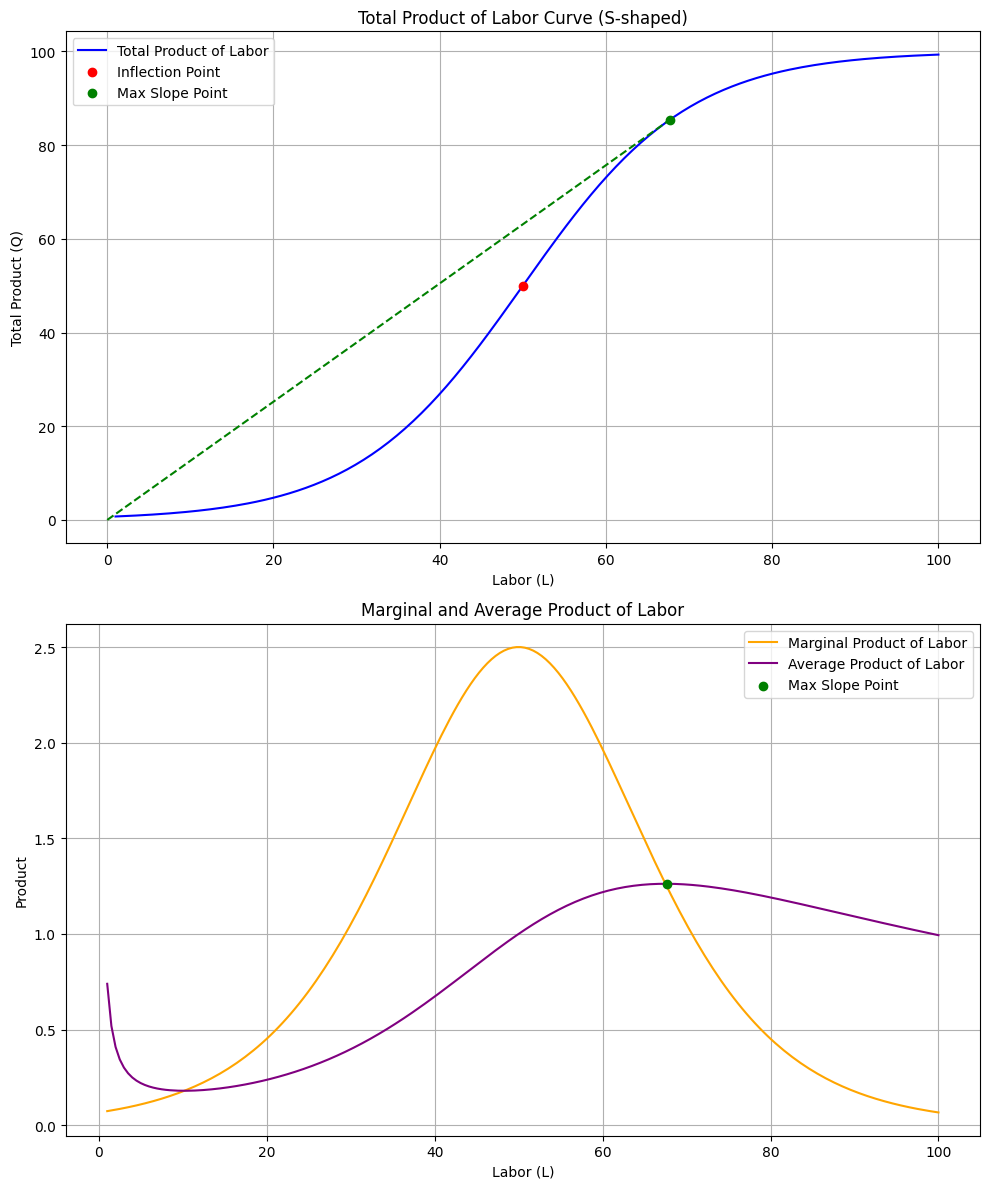 노동의 총생산(Total Production of Labor; $TP_L$) : 노동을 $L$ 단위 투입했을 때 가능한 생산량