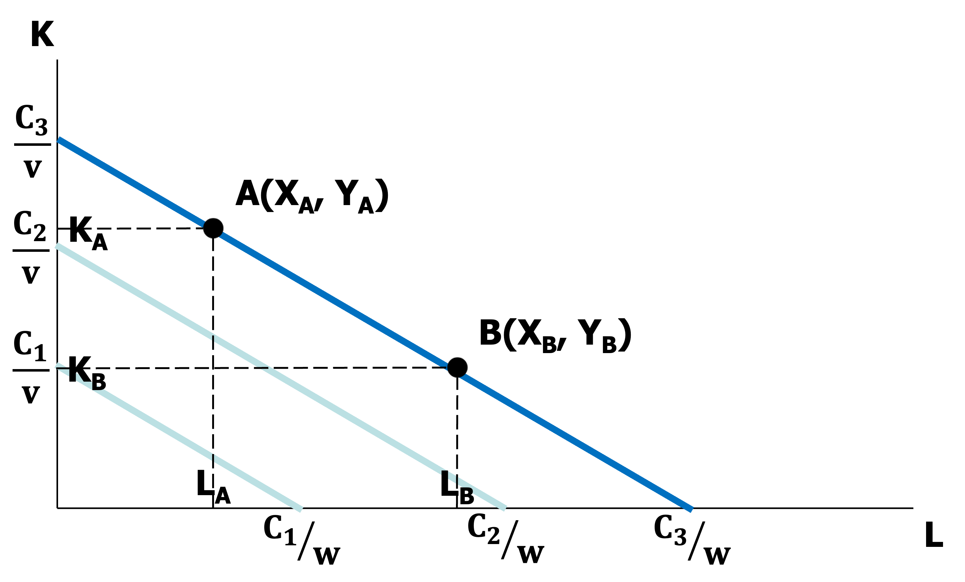등비용곡선(Iso-Cost Curve) : 주어진 비용($C$)과 요소가격 상황($P_L=w,P_K=v$)에 맞게 취득할 수 있는 요소조합의 집합