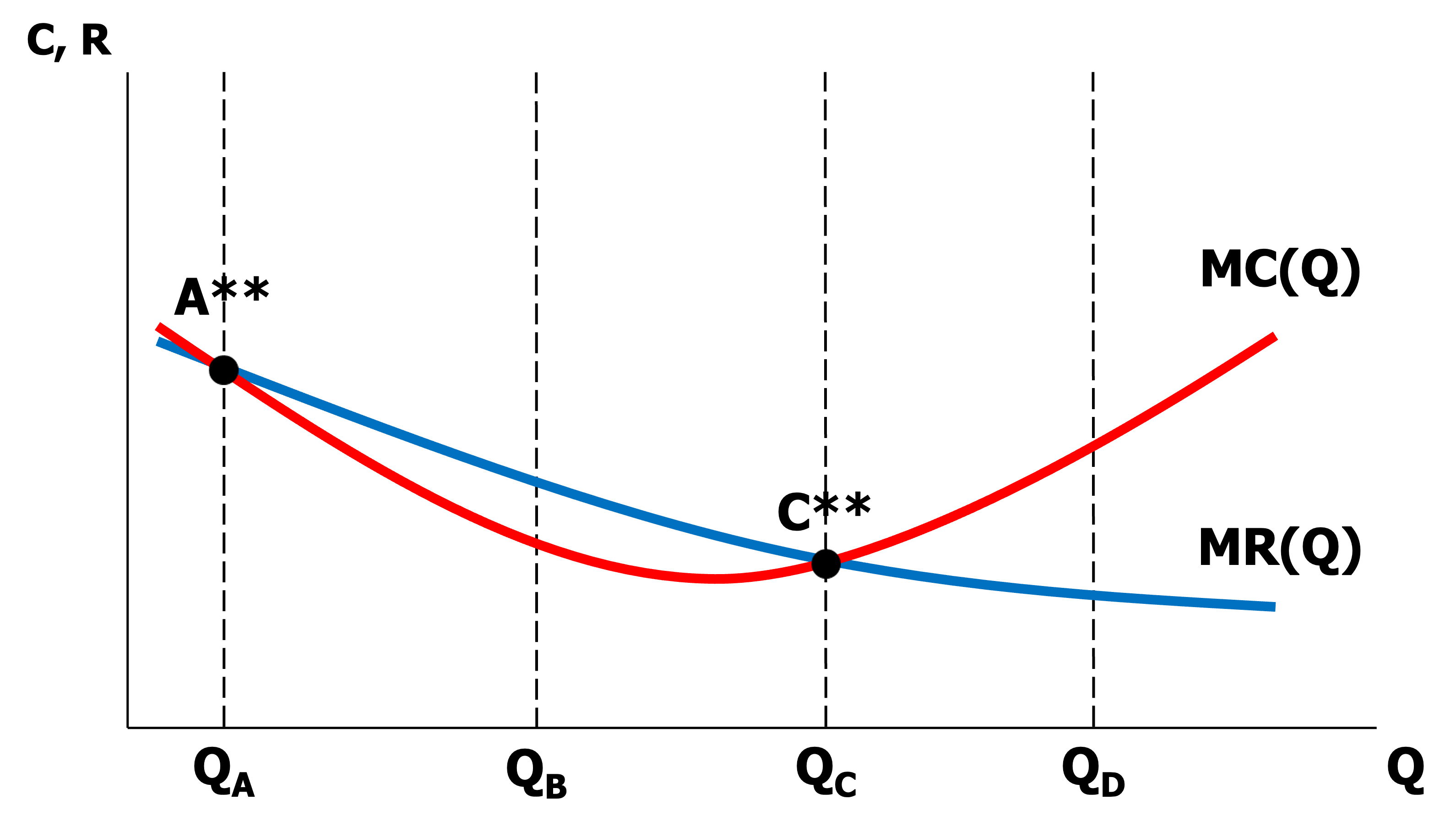 \[\begin{aligned} \frac{\partial \pi(Q)}{\partial Q} &= \frac{\partial TR(Q)}{\partial Q} - \frac{\partial TC(Q)}{\partial Q}\\ &= MR(Q) - MC(Q)\\ &=0\\\\ \therefore MR(Q)&=MC(Q) \end{aligned}\] -
