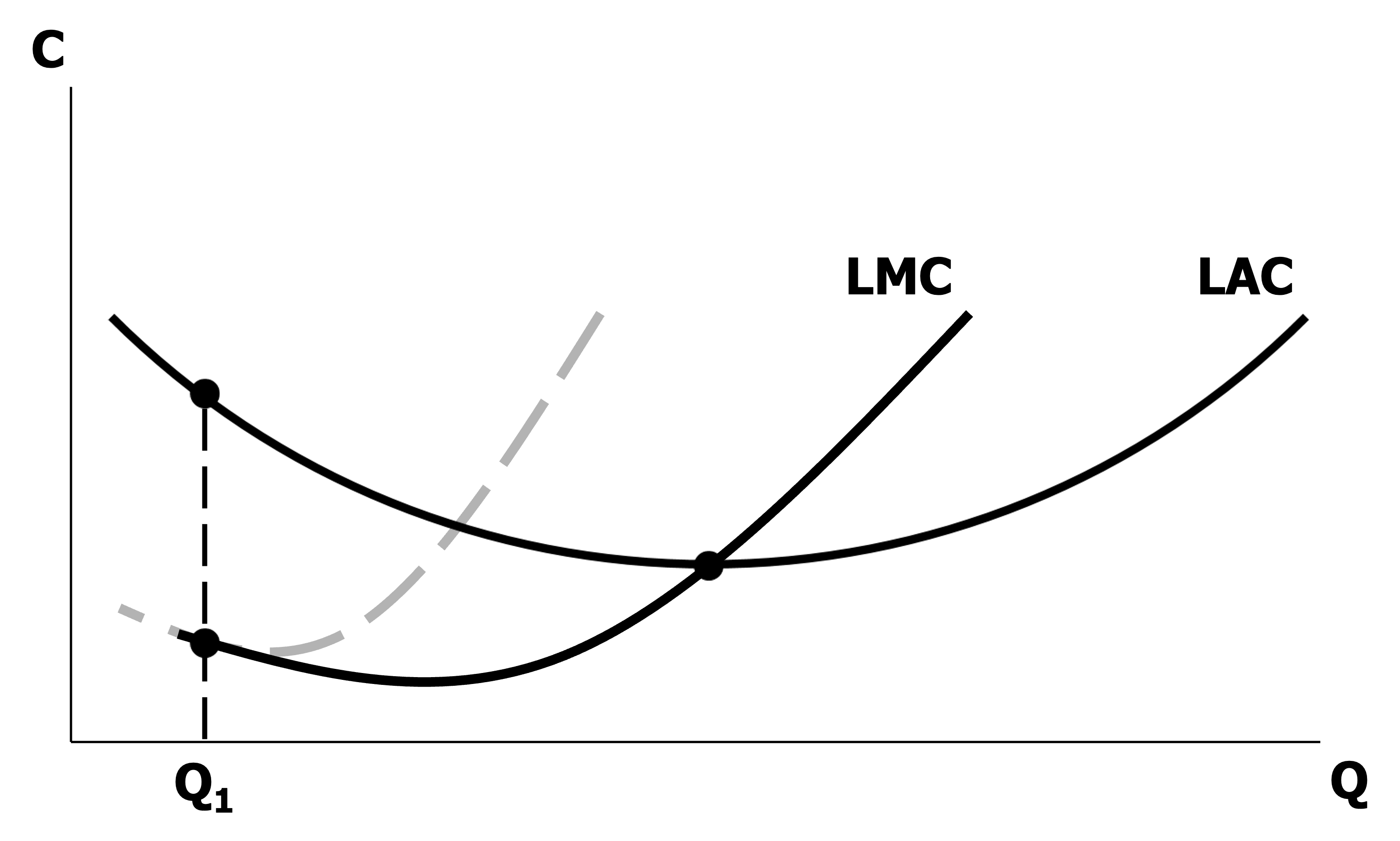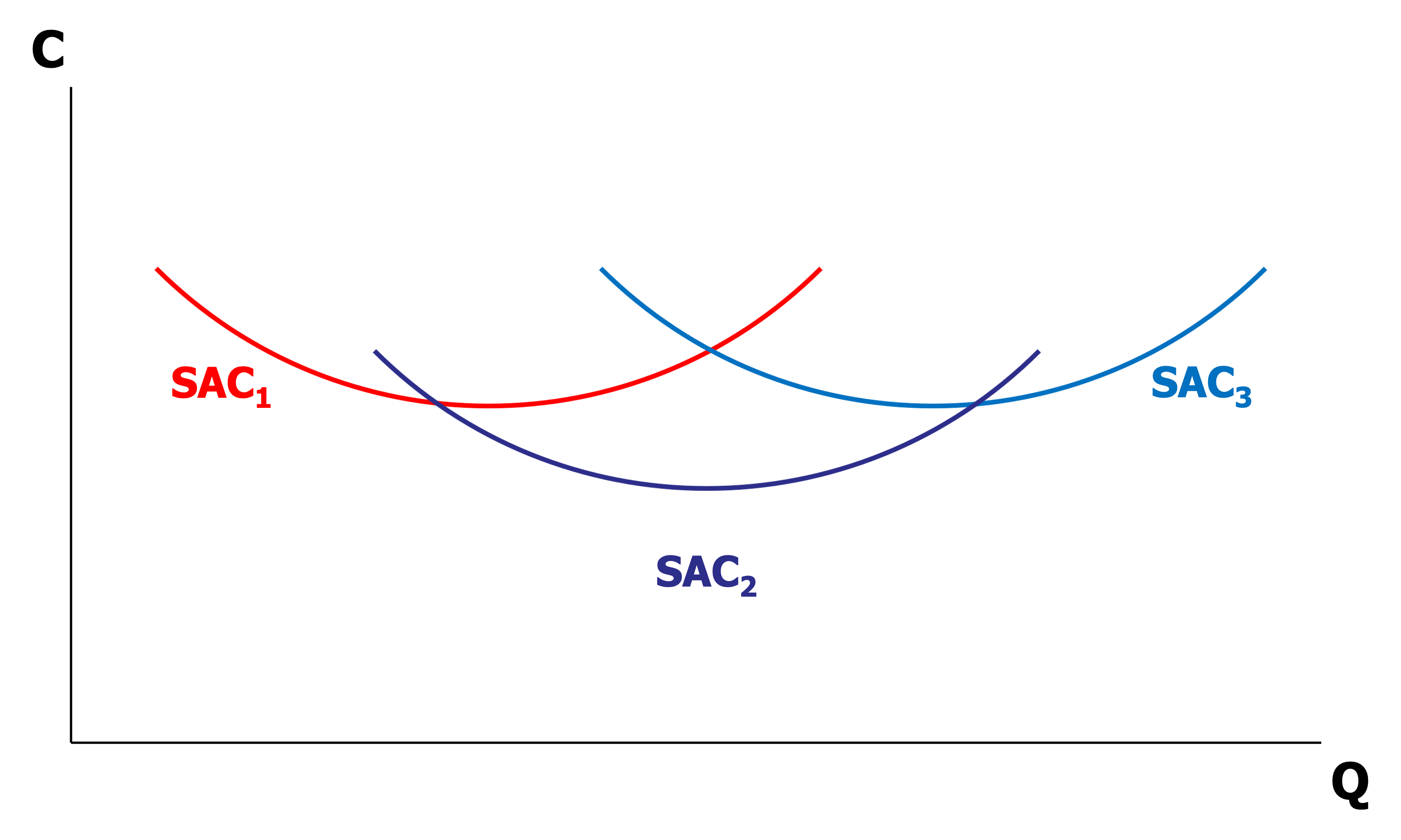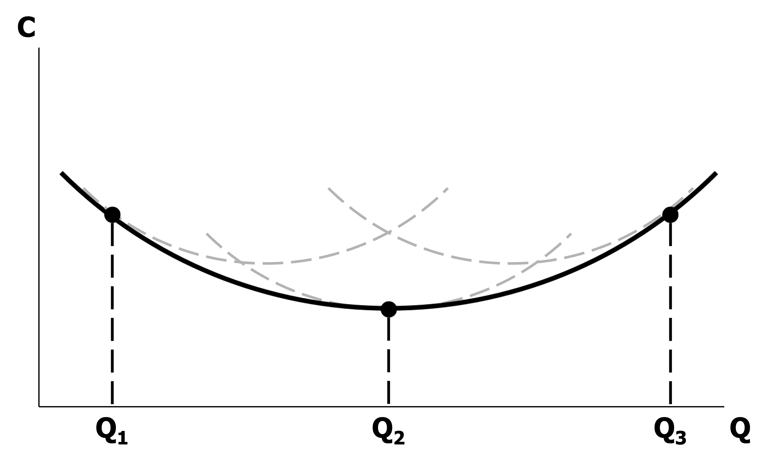 장기평균비용(Long-Term Average Cost; LAC) : 각 생산량 수준($Q$)에서 단기평균비용이 최저인 점들의 집합