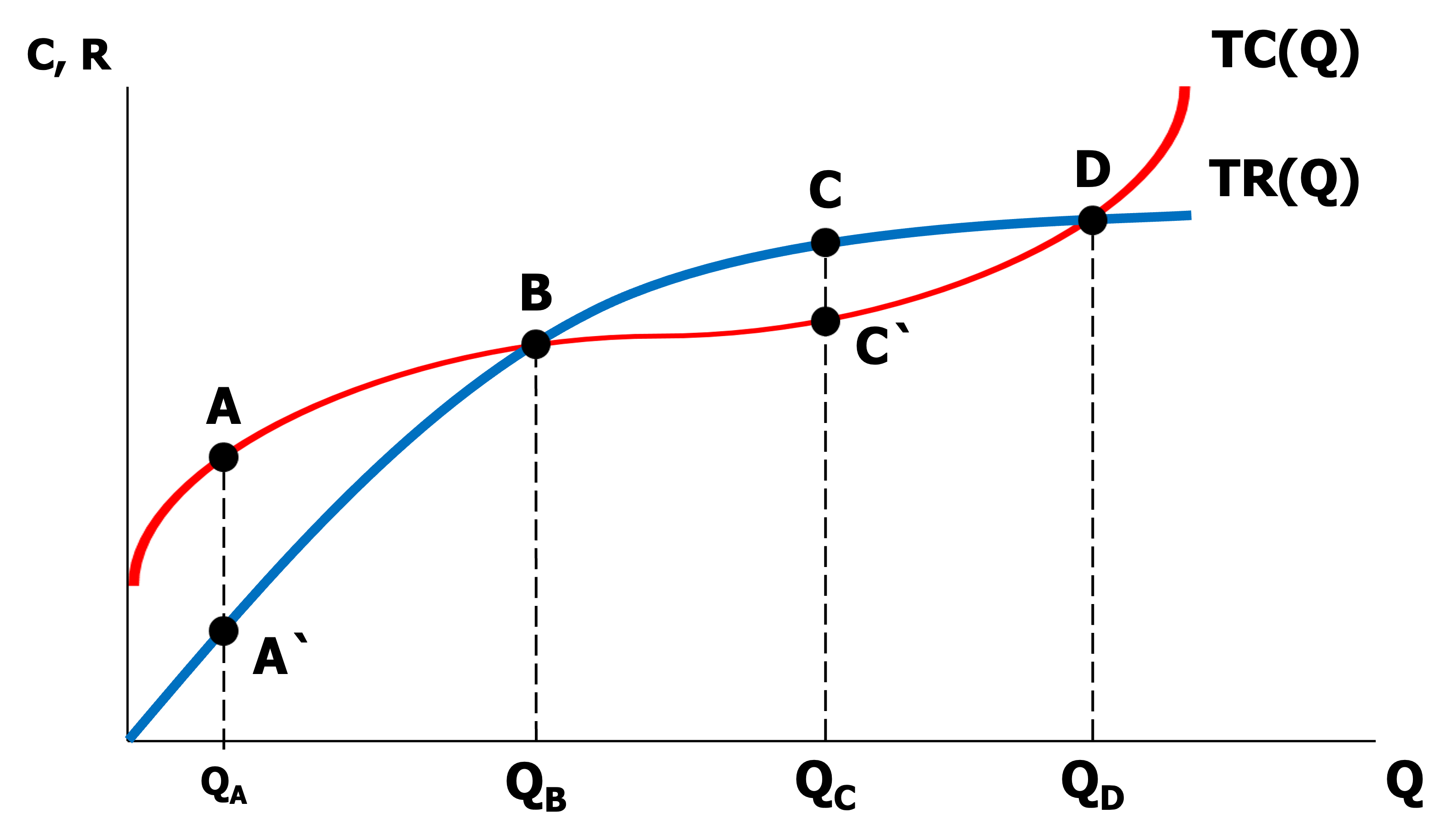 \[\pi(Q) = TR(Q) - TC(Q)\] -