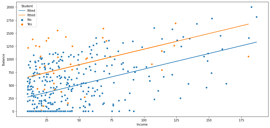 - $\beta_2$ : 학생이 아닌 사람의 $x$(Income) 단위 변동에 따른 $y$ 변동성