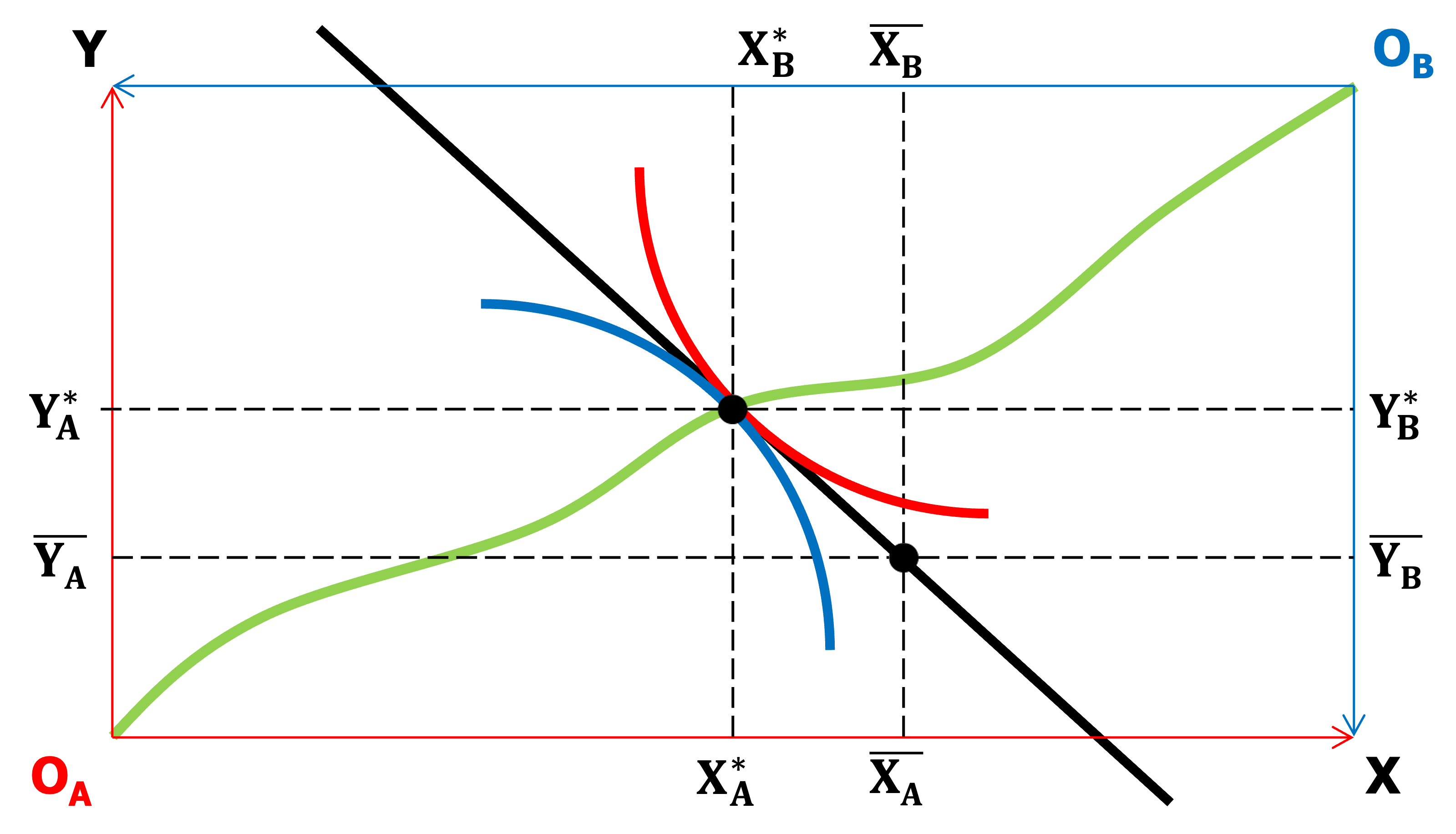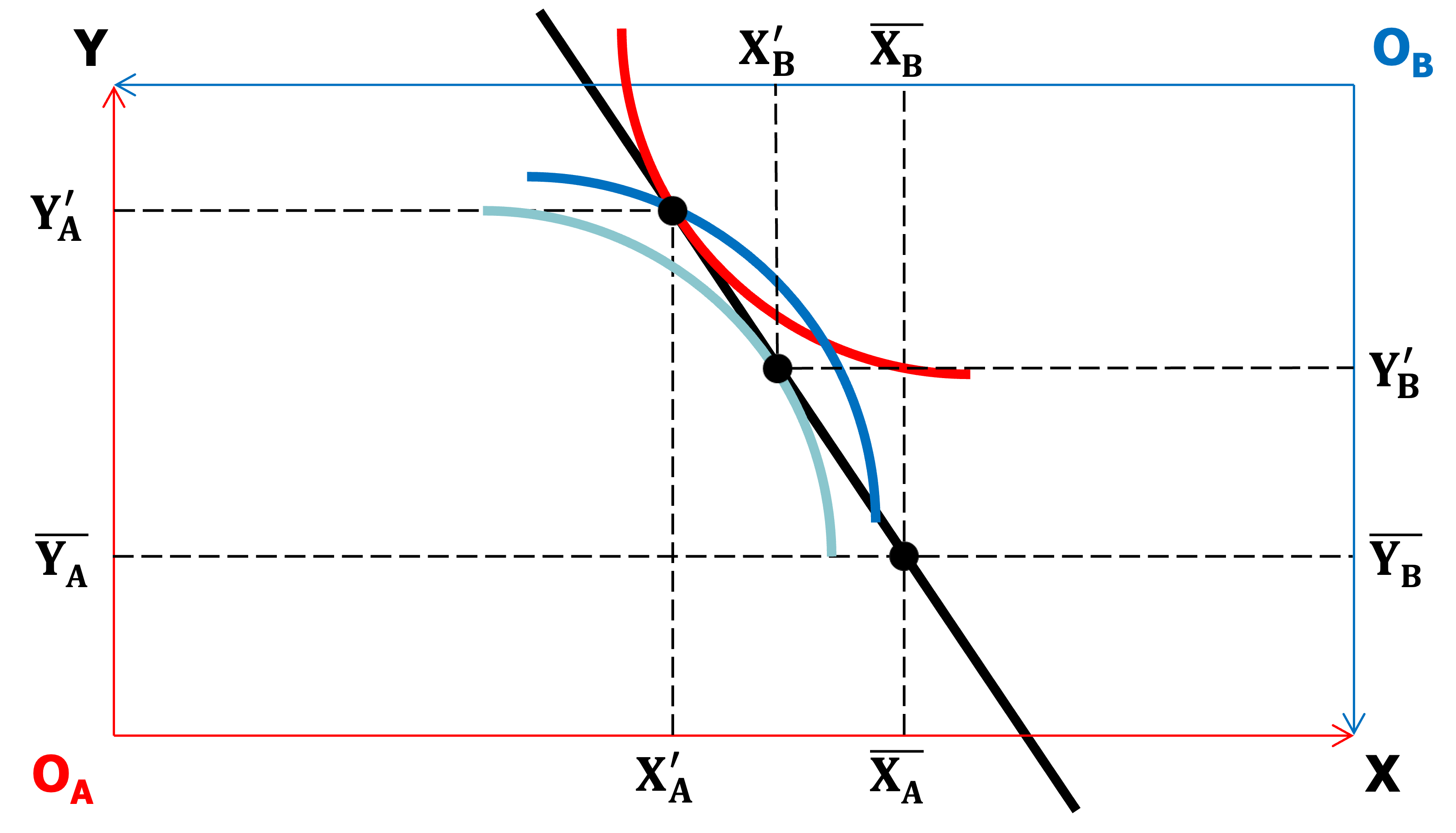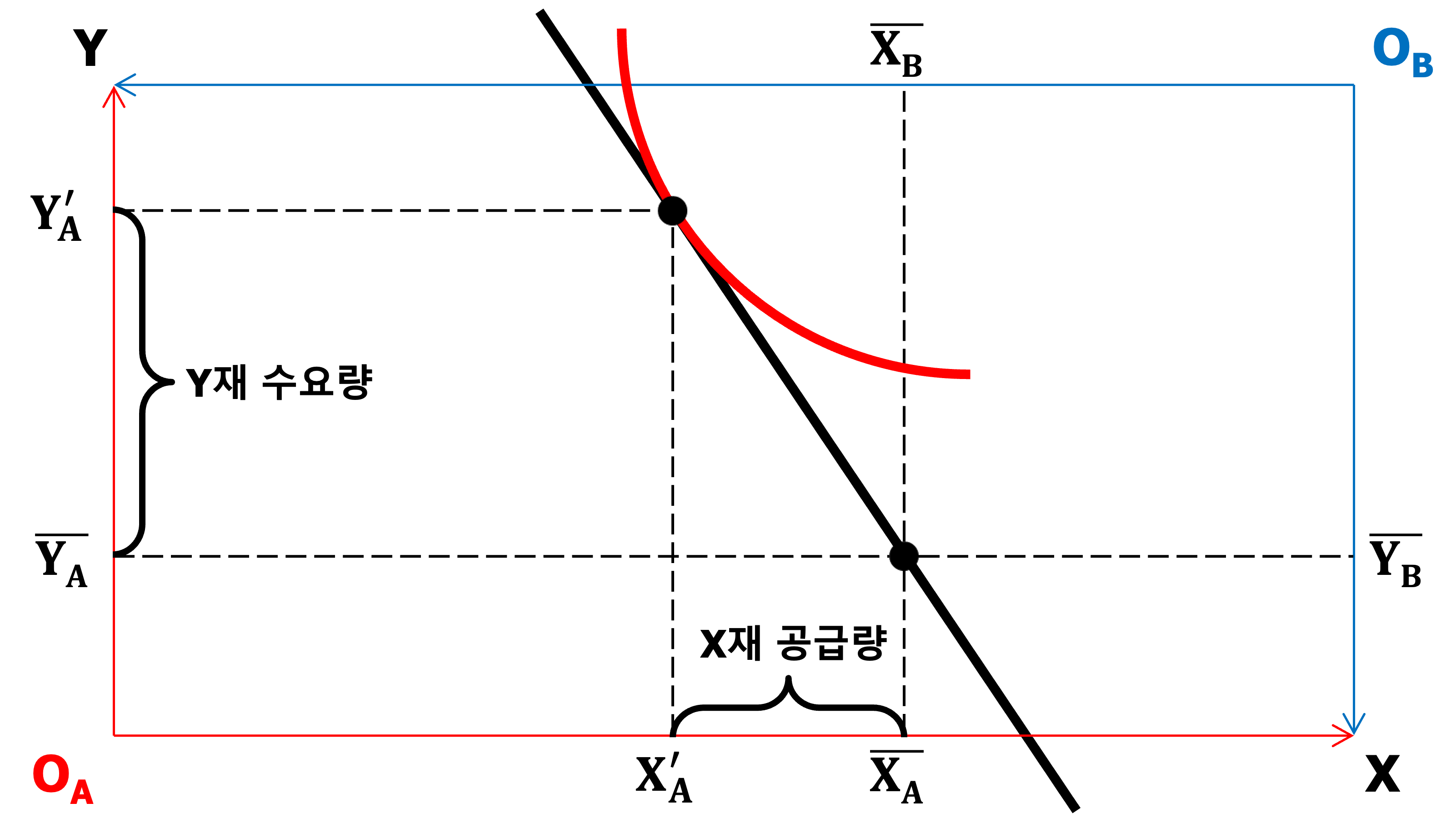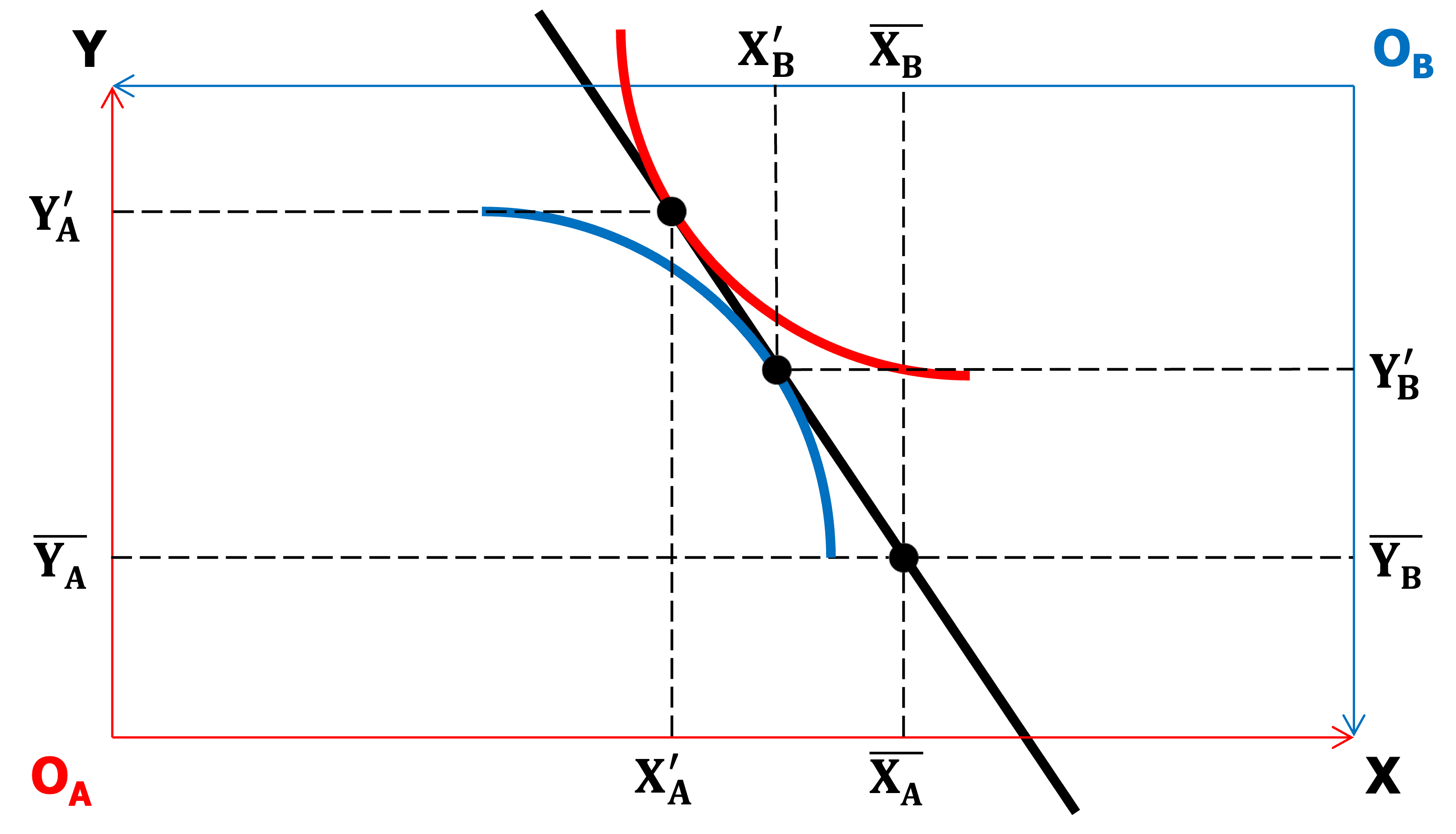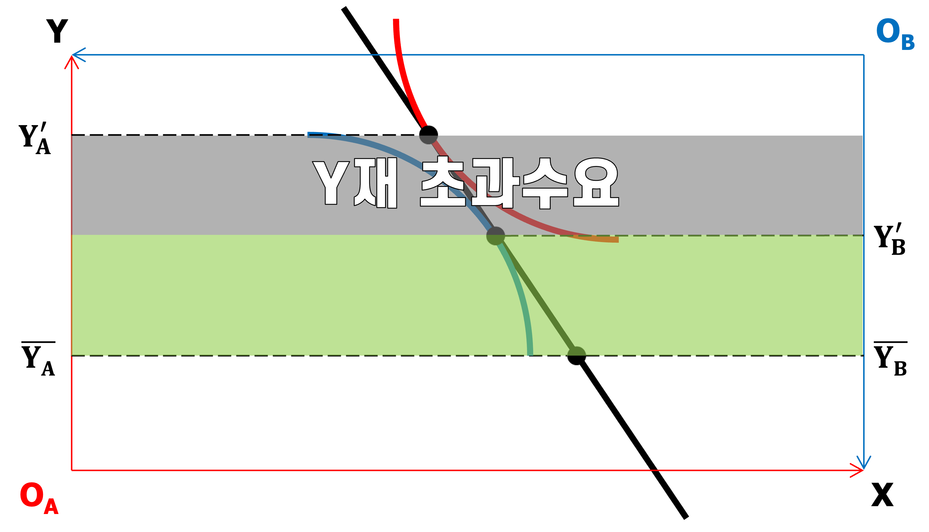 - 자원 $Y$ 의 부존량 $Y=\overline{Y}_A+\overline{Y}_B$