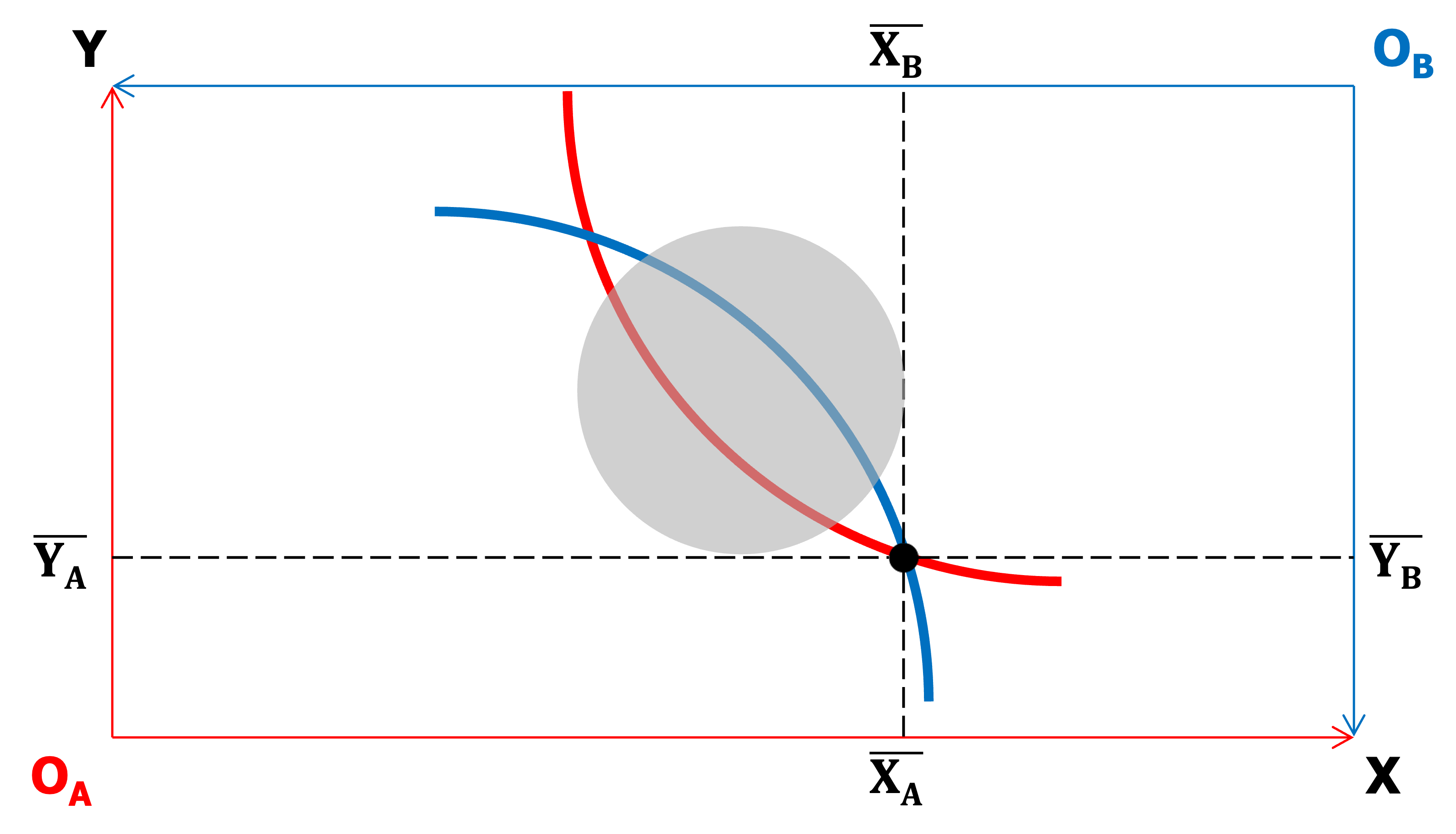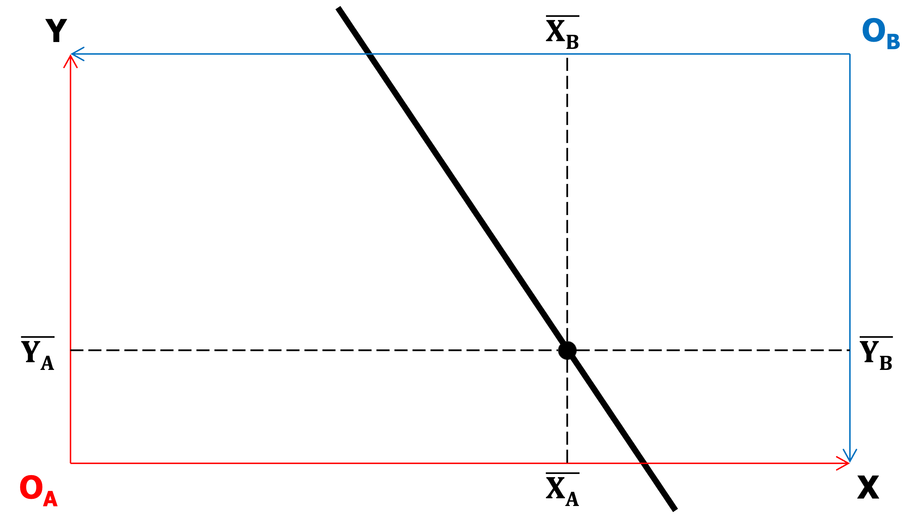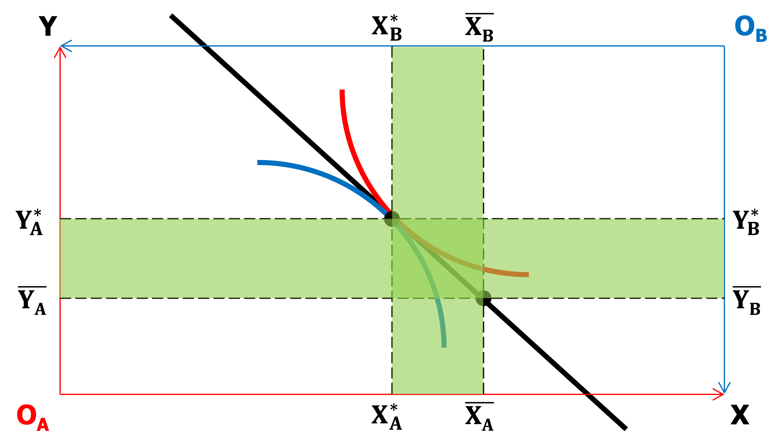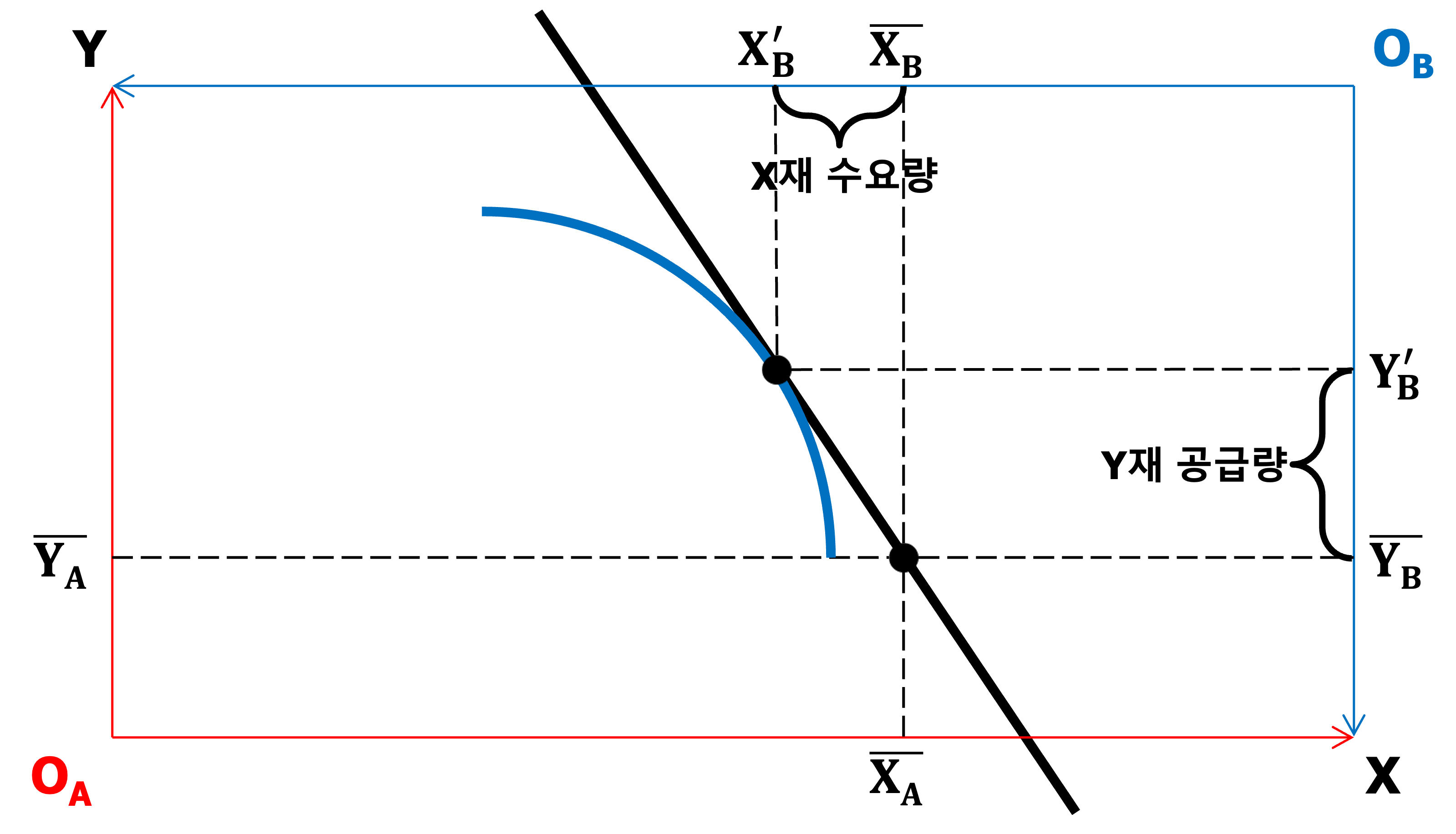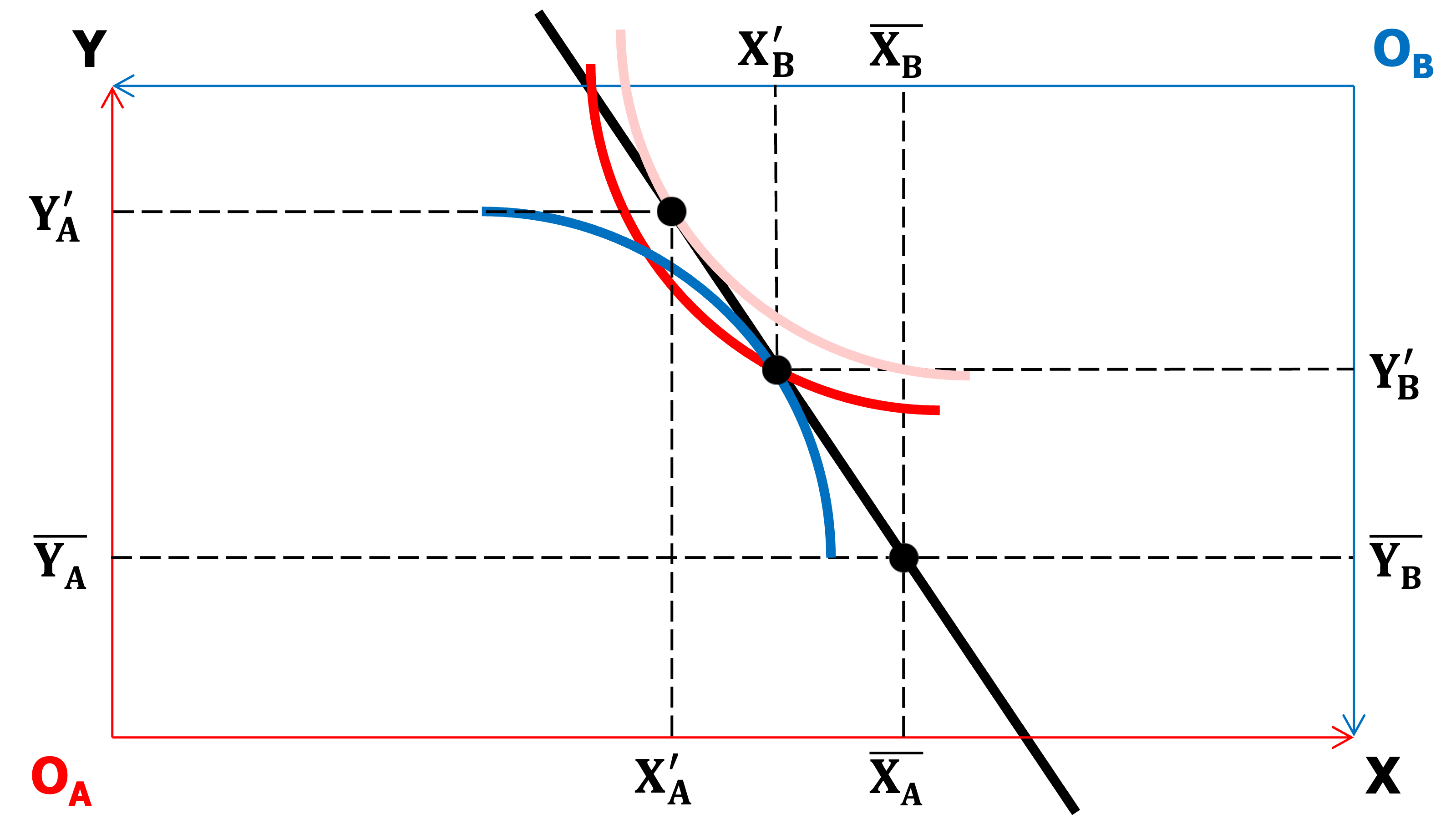 - 자원 $Y$ 의 부존량 $Y=\overline{Y}_A+\overline{Y}_B$