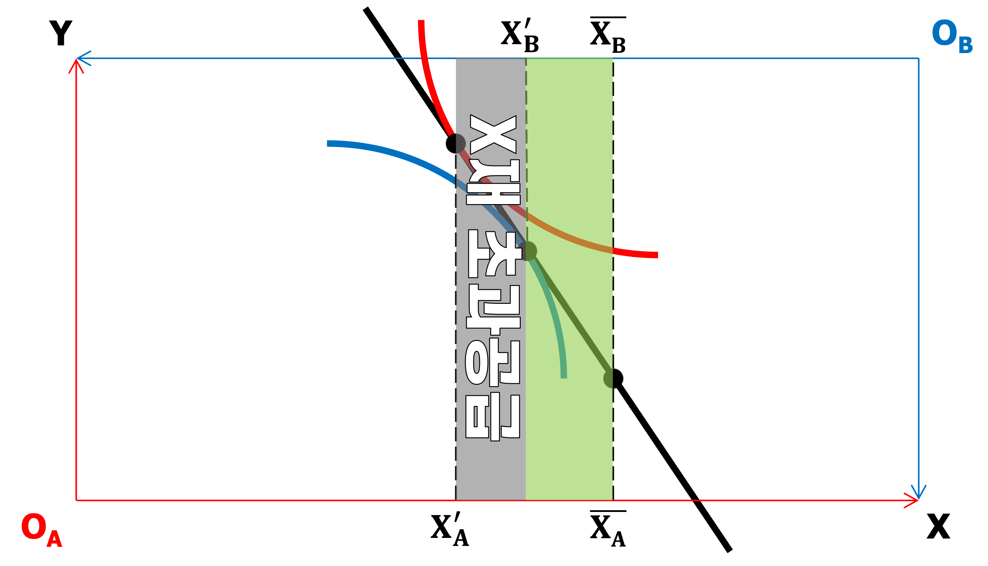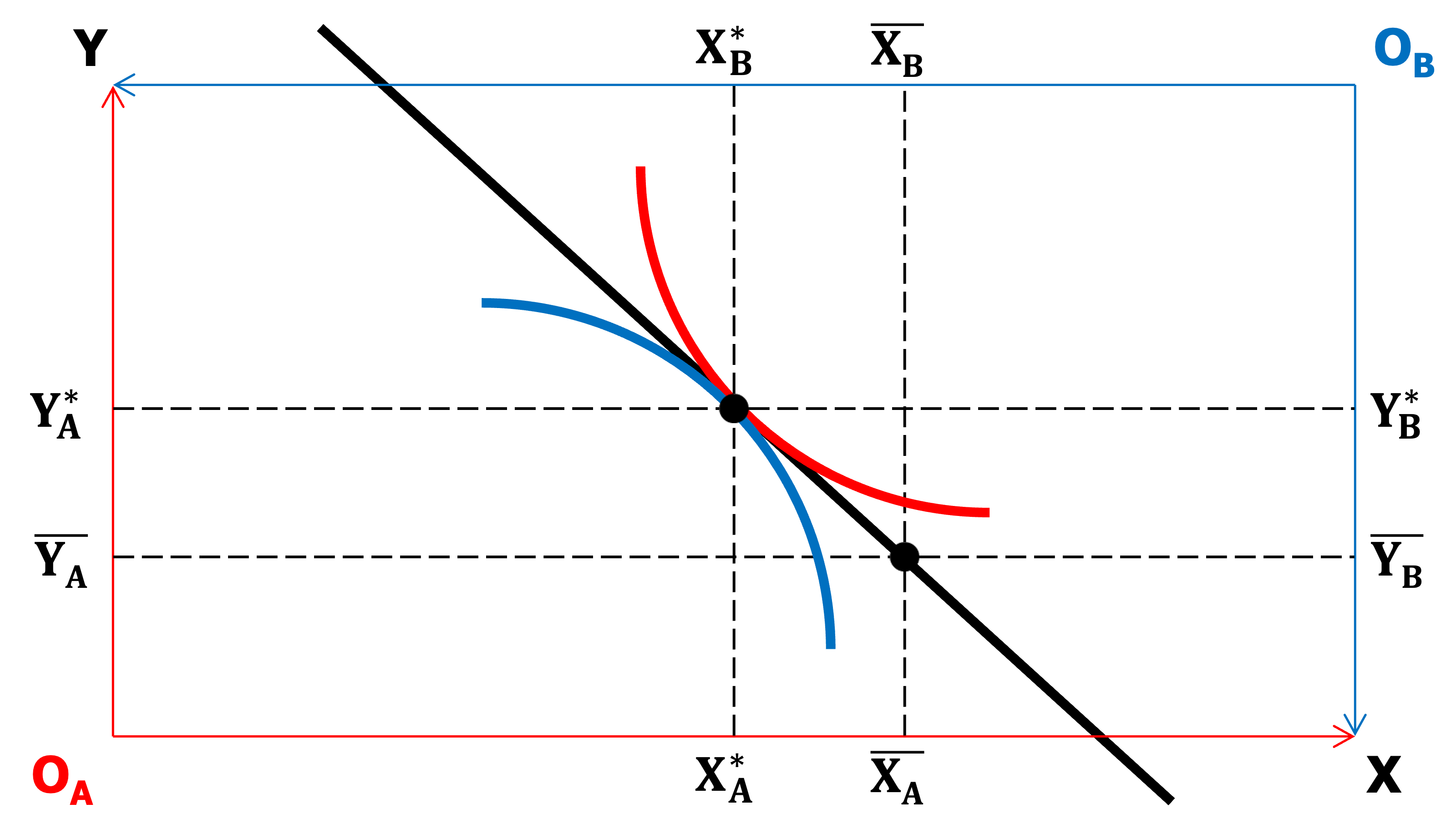 - 자원 $X$ 의 부존량 $X=\overline{X}_A+\overline{X}_B$