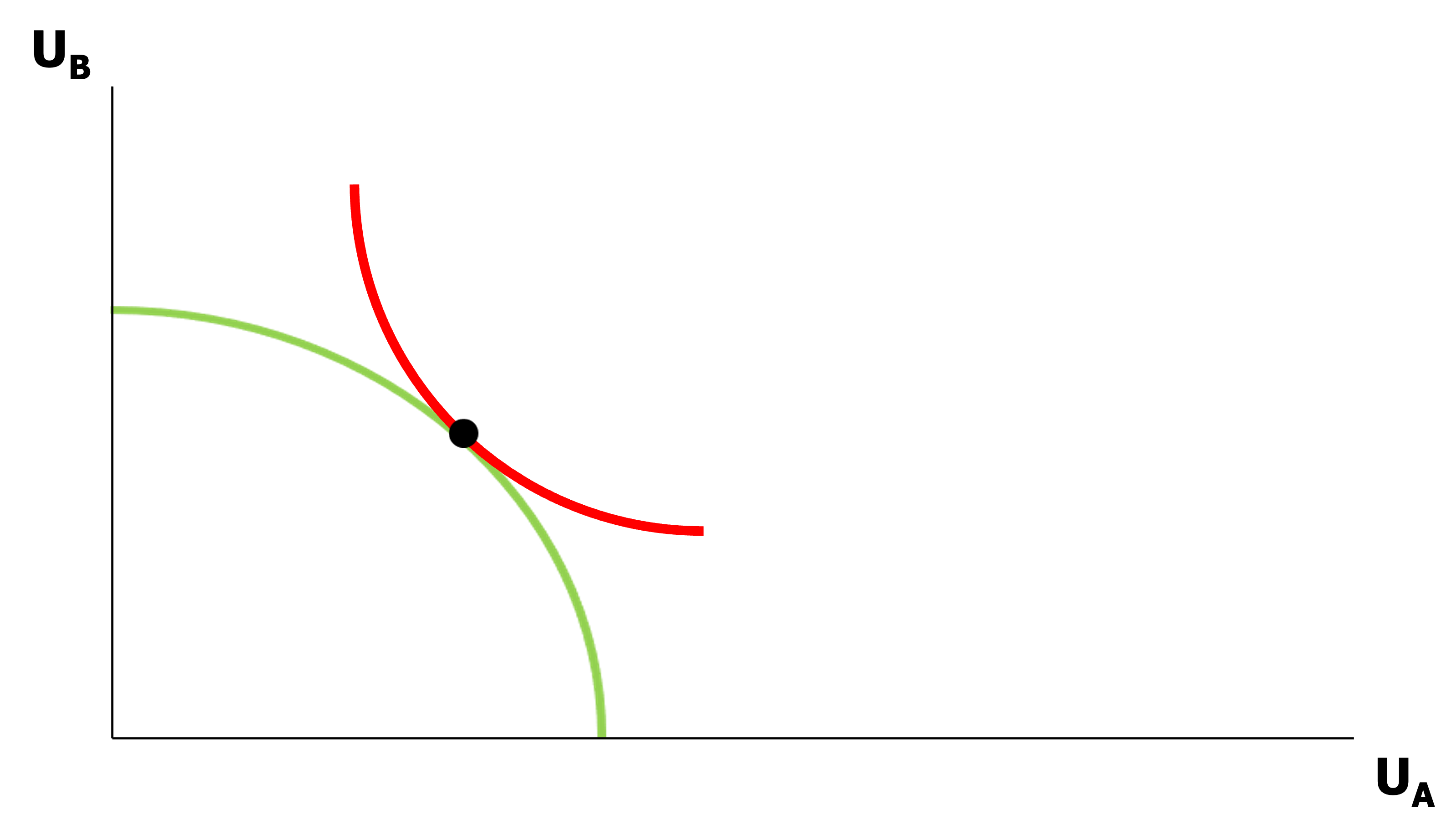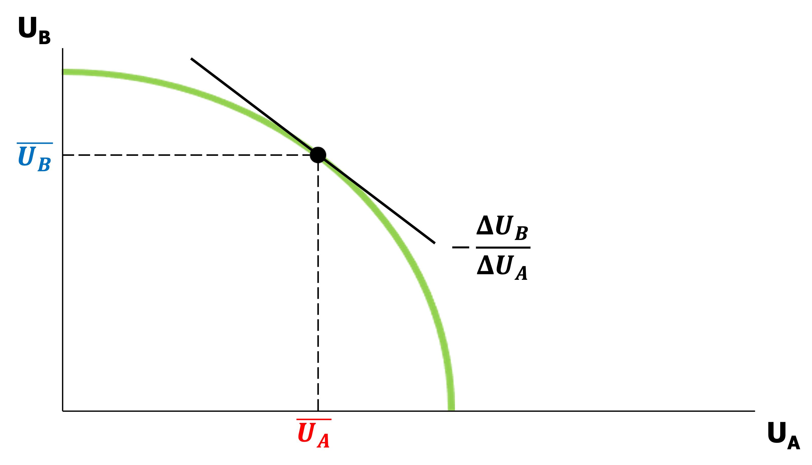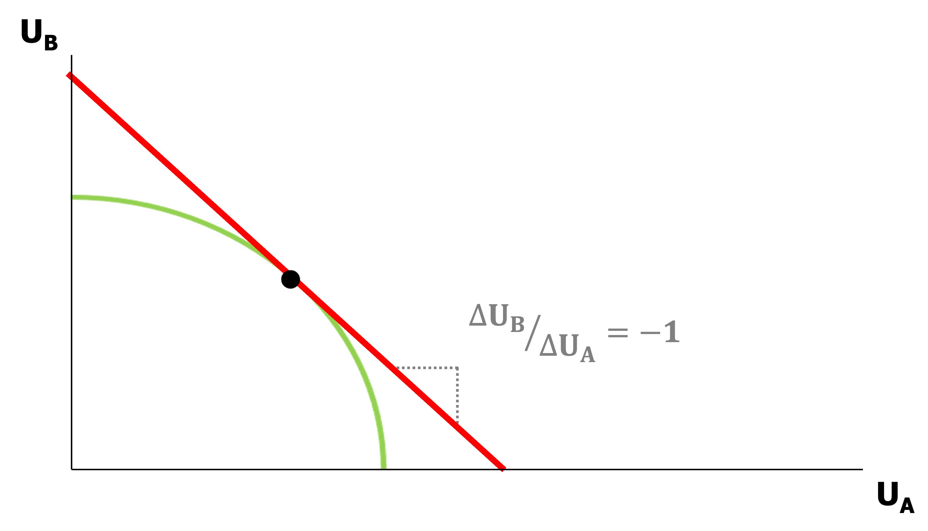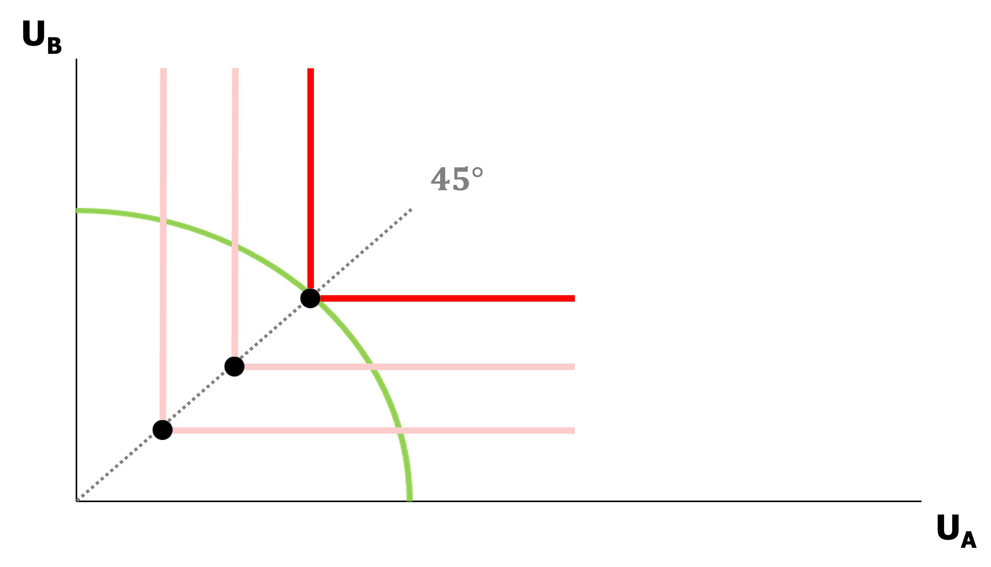 \[SW=\min{\left[U_{A},U_{B}\right]}\]사회 구성원들에게 무지의 베일을 씌운 원초적 상황 하에서 민주적으로 자원 배분 정책을 수립한다고 하자. 타인의 이익에 무관심하고 오로지 자신의 이익에만 관심이 있음에도 불구하고, 사회 구성원들은 자신이 최악의 상황에 처할 가능성을 고려하여 최소극대화 원칙에 근거한 배분 정책을 수립할 것임.