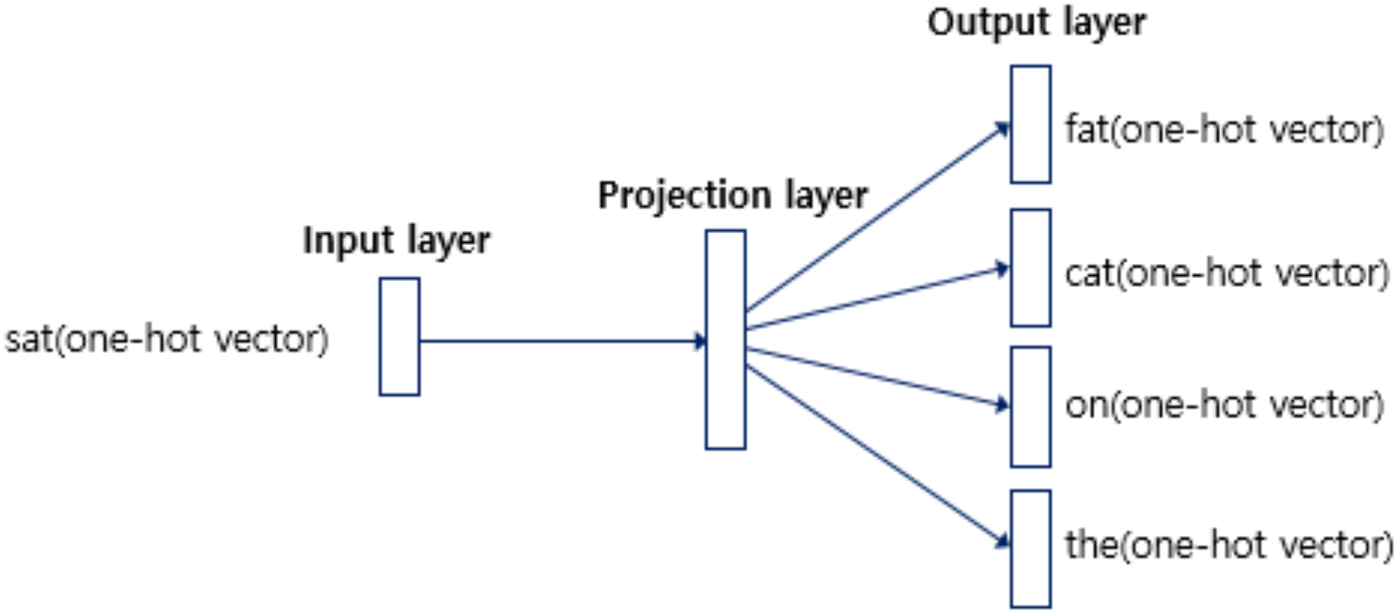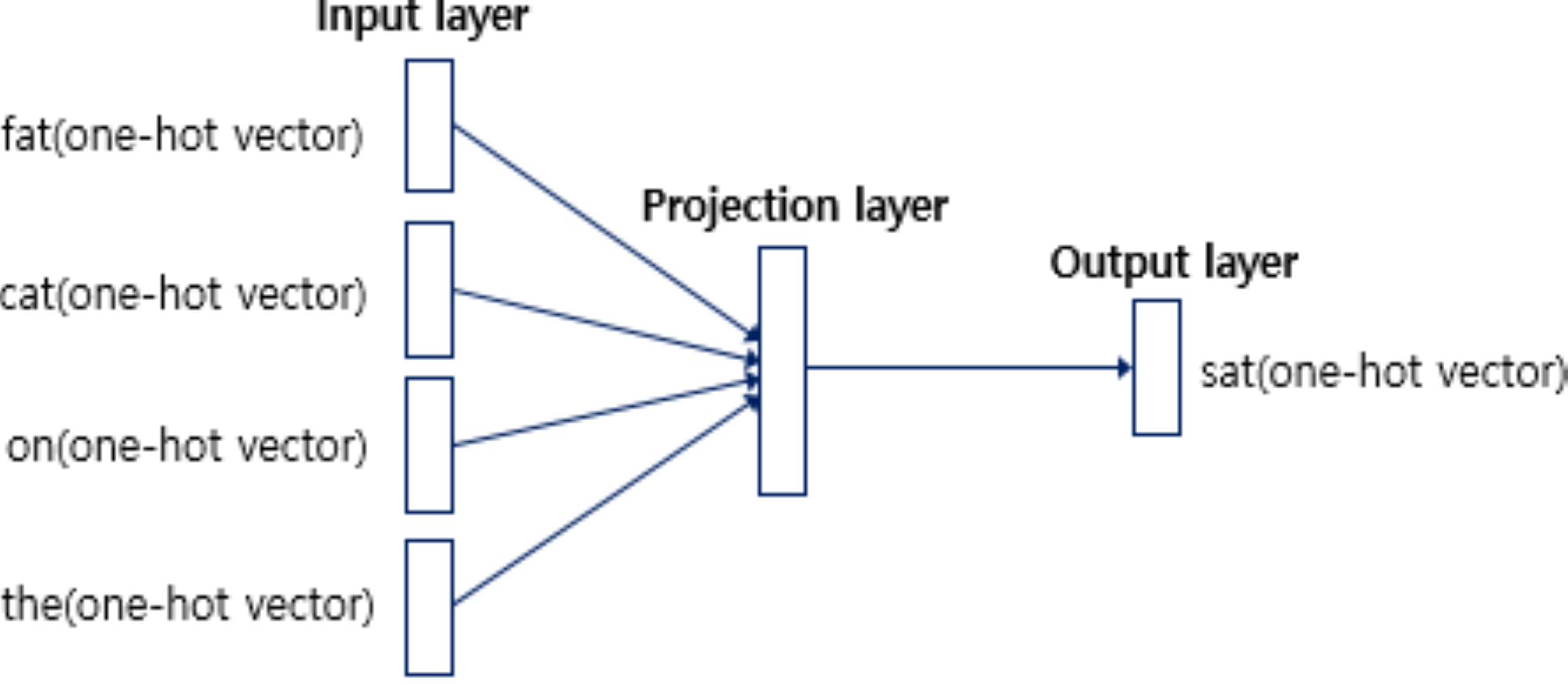 \[\begin{aligned} \mathbf{z}_{i} &= \frac{1}{2 \omega} \sum_{j}{\mathbf{x}_{j} \cdot \mathbf{W}} \end{aligned}\]INPUT→PROJECTION- \(\mathbf{w}_{j} = \mathbf{x}_{j} \cdot \mathbf{W} \in \mathbb{R}^{D}\) : Embedding Vector of Context Word \(j\)